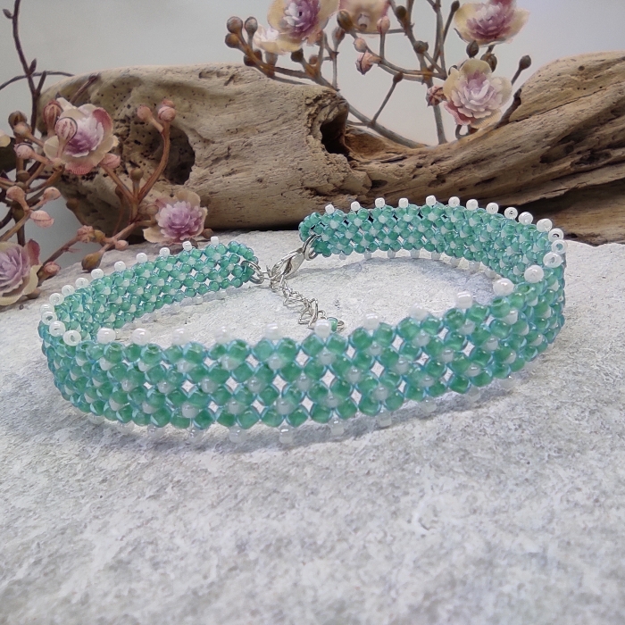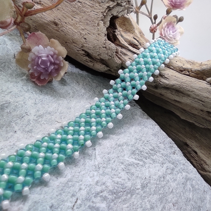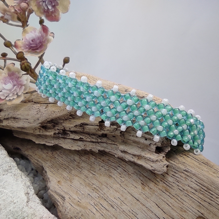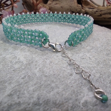 Jemný elegantní náramek je ručně ušit z japonských rokajlových korálků v kombinaci čiré zeleno-modré a černé