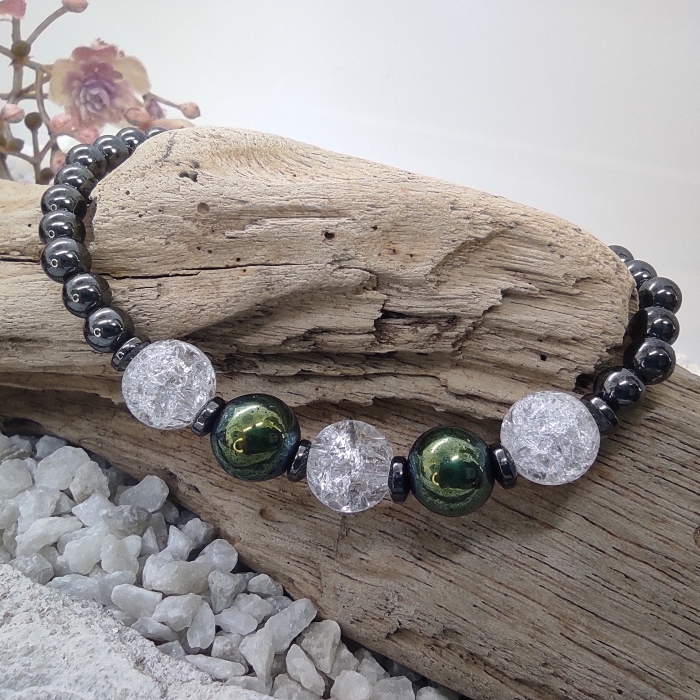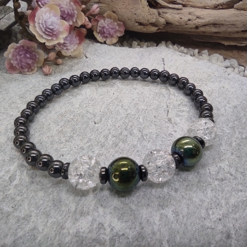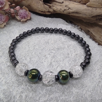 Jemný elegantní náramek je ručně ušit z japonských rokajlových korálků v kombinaci matné zelené s pokovem a zlaté