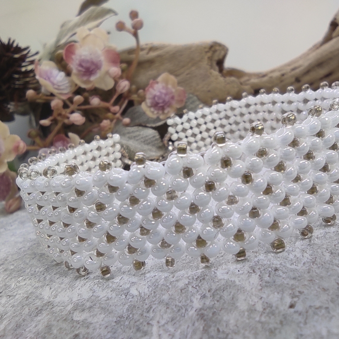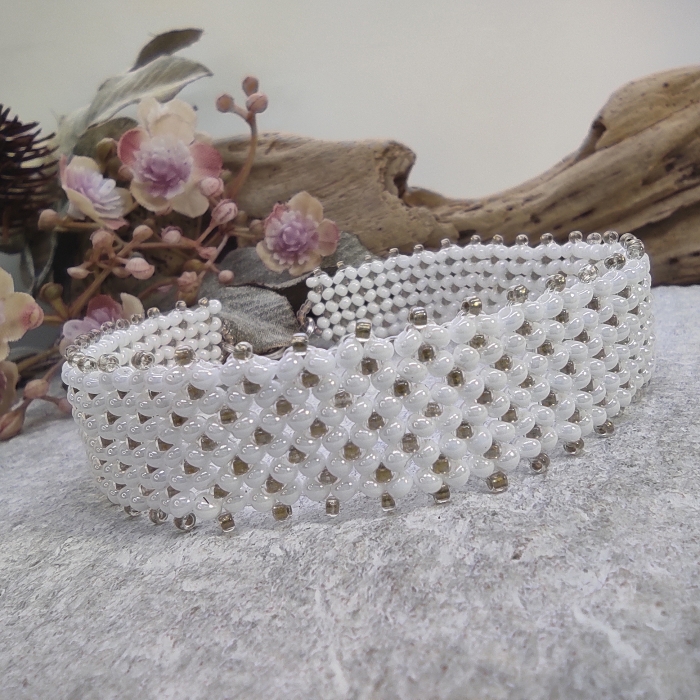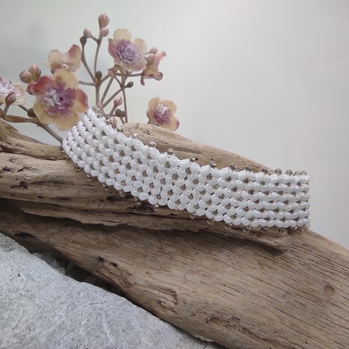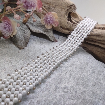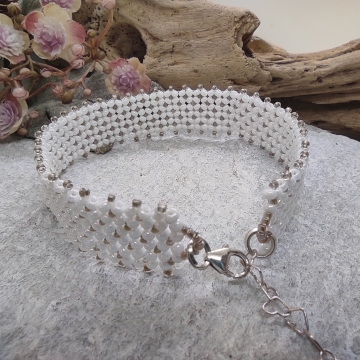 Jemný náramek v kombinaci bílých rokajlových korálků, syntetického tyrkysu, korálků s diamantovým prachem a korálků z chirurgické oceli.