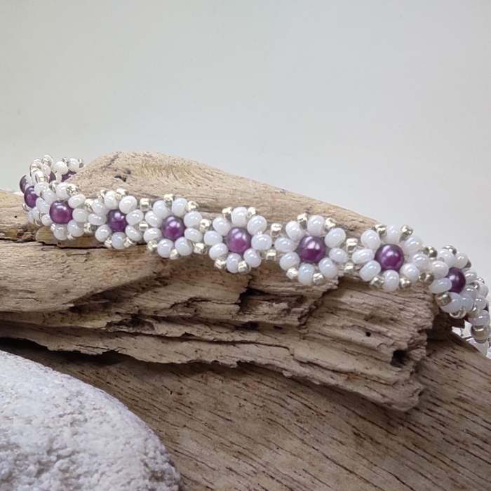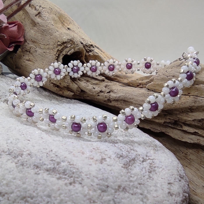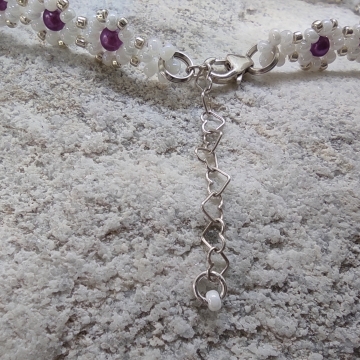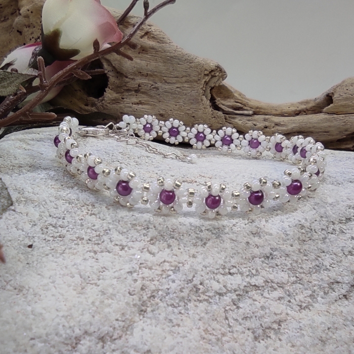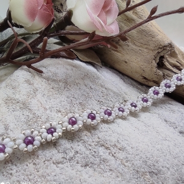 Jemný elegantní náramek je ručně ušit z českých a japonských rokajlových korálků v kombinaci bílé perlové a čirého crystalu se stříbrným průtahem