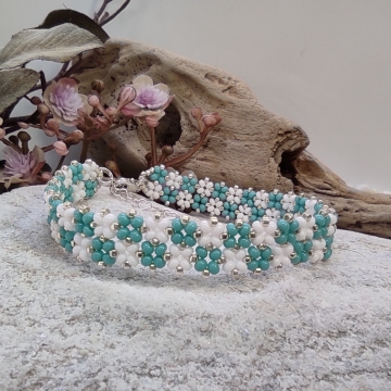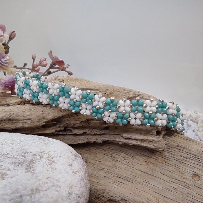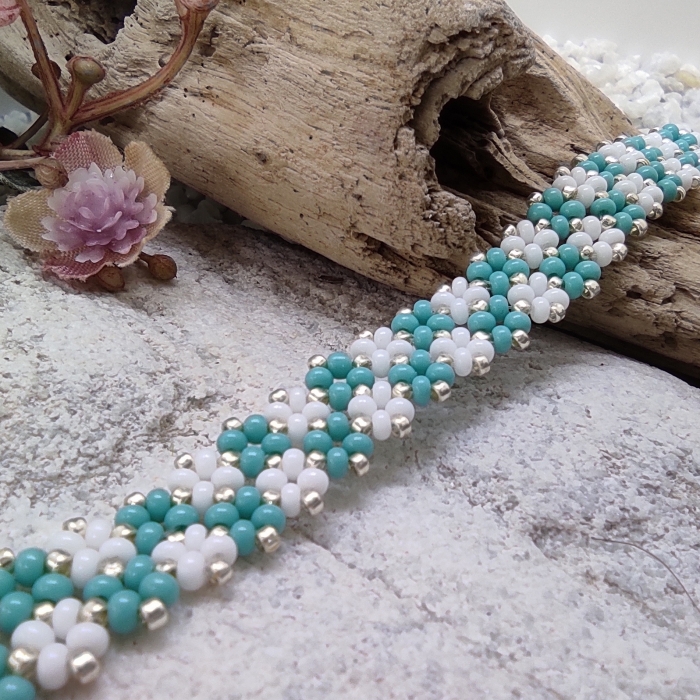 Jemný elegantní náramek je ručně ušit z českých a japonských rakajlových korálků v kombinaci bílé a duhové se zlaceným lemováním