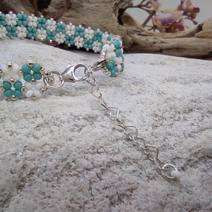 Náramek je zakončen karabinkou a prodlužovacím řetízkem z Ag