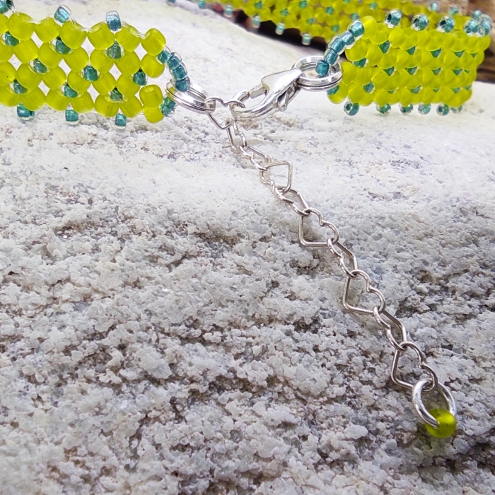Náramek je zakončen karabinkou a prodlužovacím řetízkem z Ag