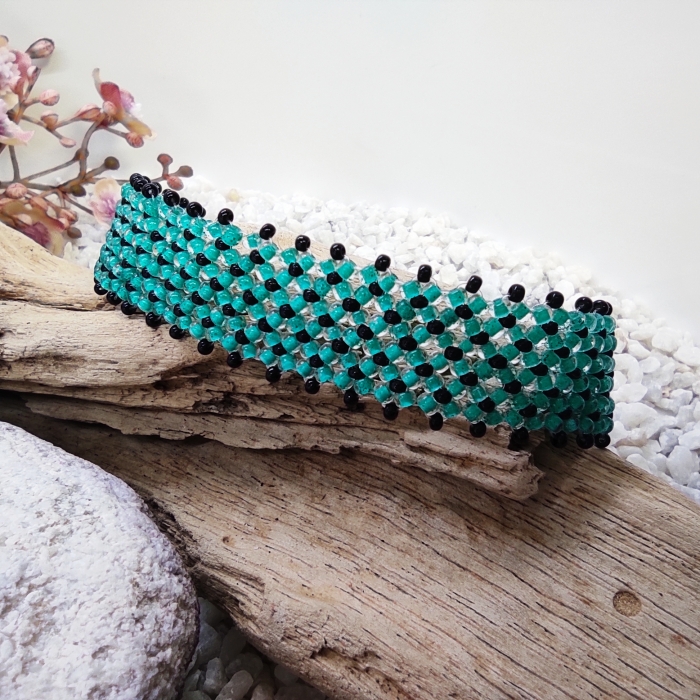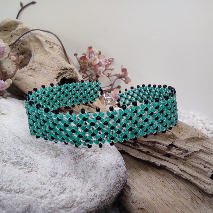 Jemný elegantní náramek je ručně ušit z japonských rokajlových korálků v kombinaci cihlově červené a stříbrného matného crystalu
