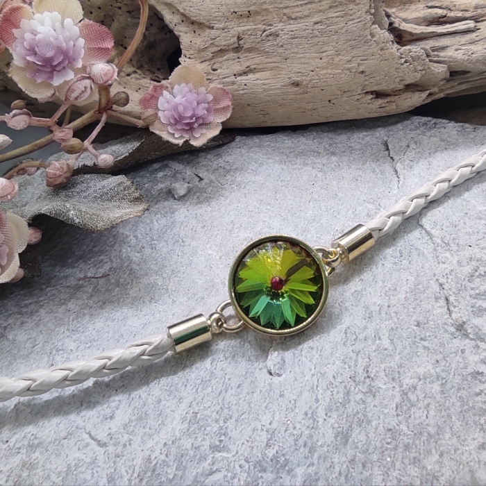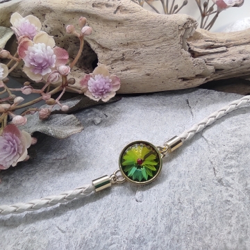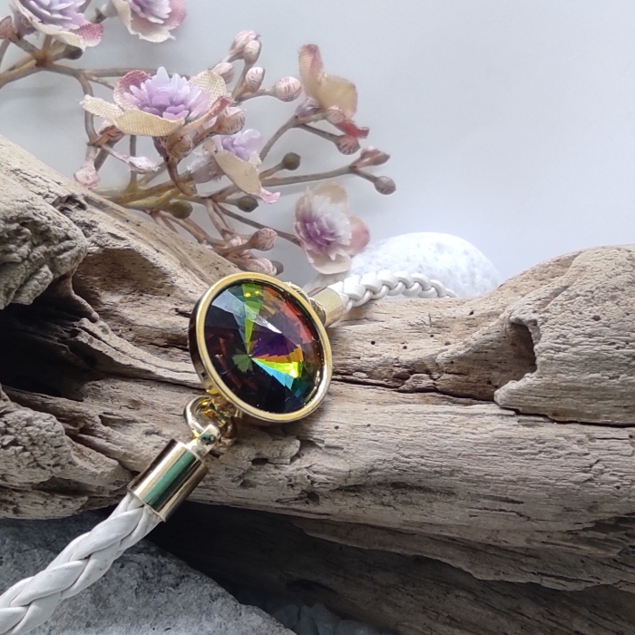 Jemný elegantní náramek z pravé kůže je dozdoben krásným zeleno-modro-fialovým Swarovski krystalem