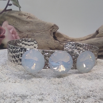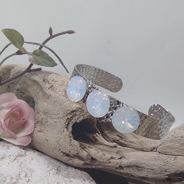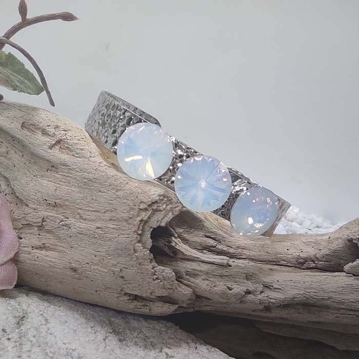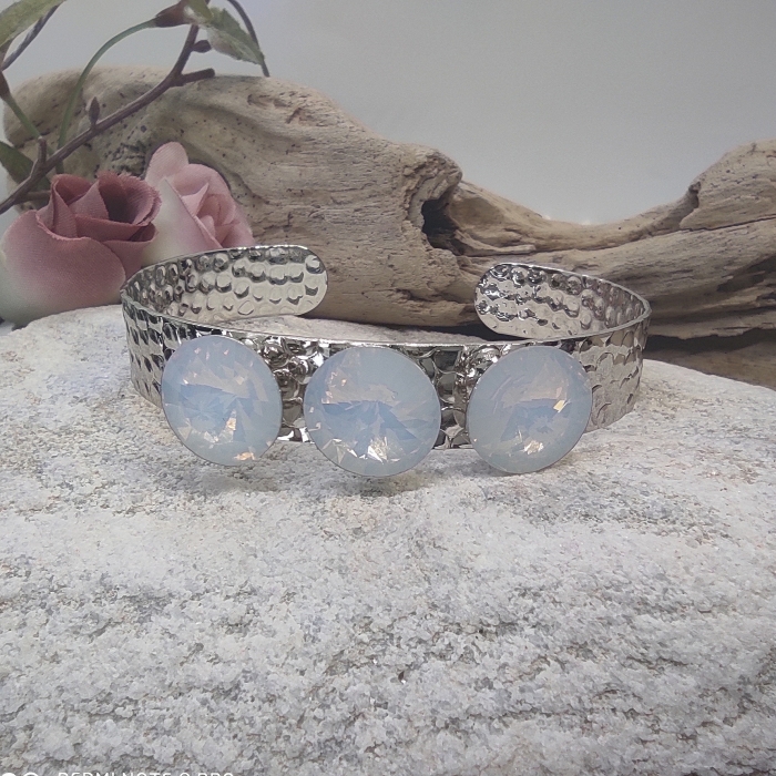 Tepaný náramek z bižuterního kovu stříbrné barvy, osazený třemi krásnými Swarovski krystaly tyrkysové barvy o průměru 12 mm.
