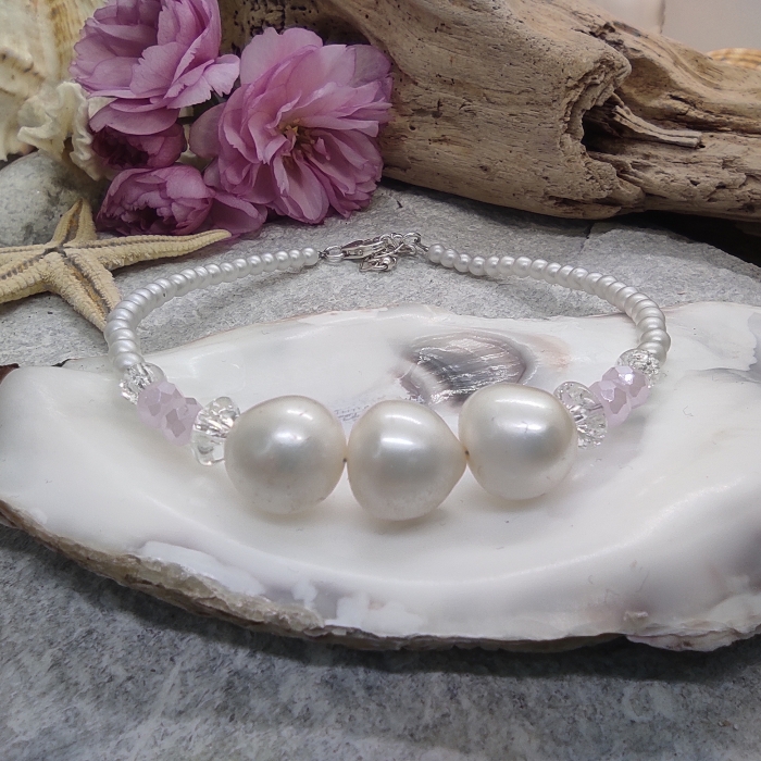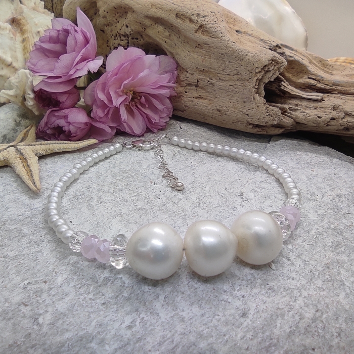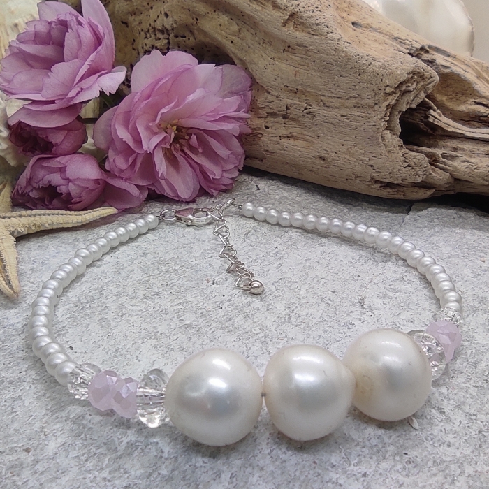 Náramek z bílých a lososových sladkovodních perel v kombinaci s korálky z Ag