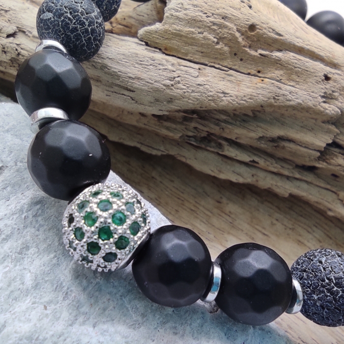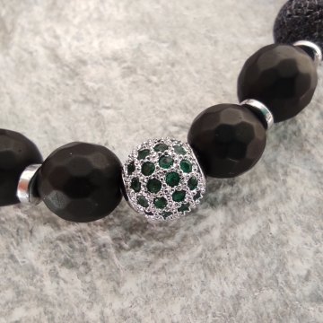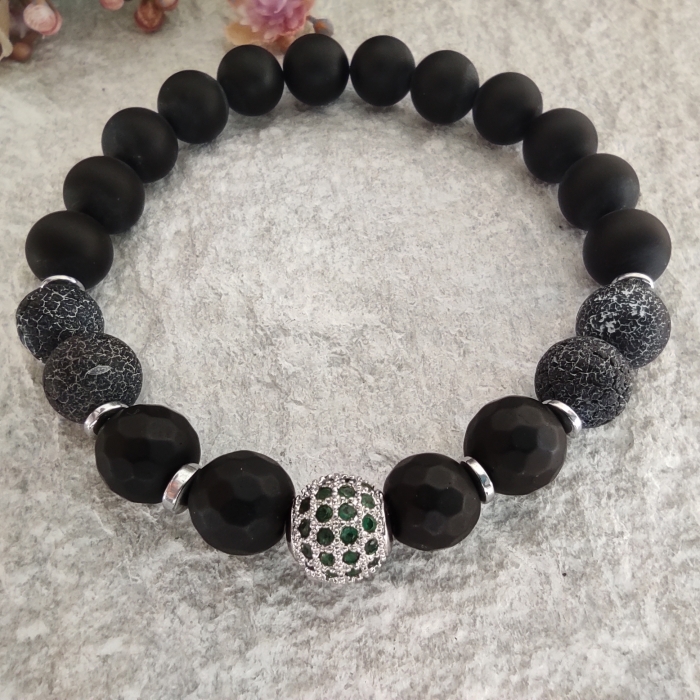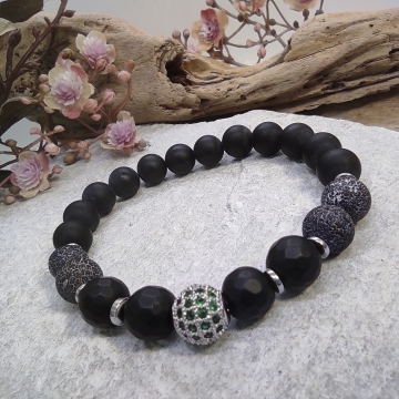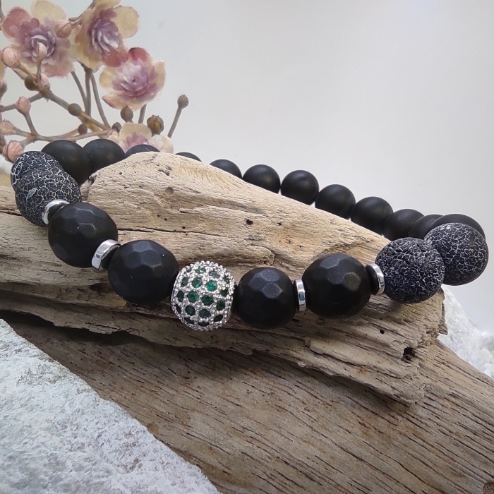 Náramek z černého a šedého achátu v kombinaci s fasetovaným černým kamenem a hematitem. Náramek je dozdoben stříbrným korálkem s tmavě zelenými zirkony.